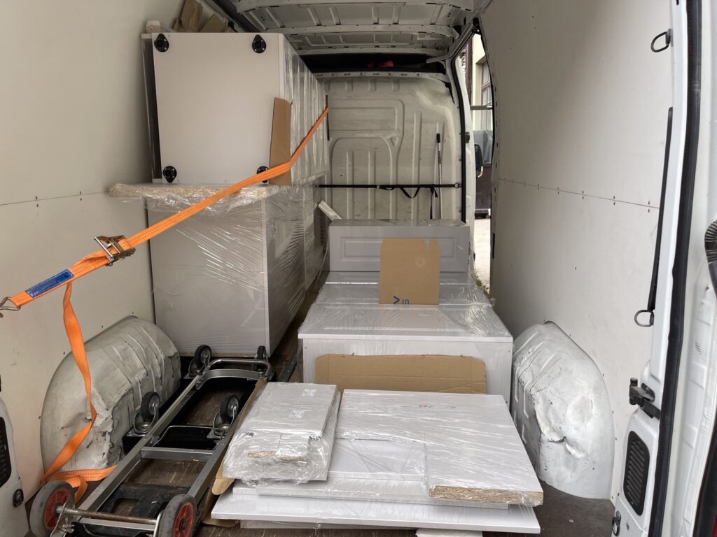 Tačiau svarbiausia detalė šioje nuotraukoje yra krovinio tvirtinimas: matote ryškų oranžinį diržą, einantį per visą krovinį? Be šio saugumo elemento mes nepajudame iš vietos. Baldai pritvirtinti prie kėbulo sienos taip stabiliai, kad net ir staigiau stabdant ar važiuojant per duobėtus daugiabučių kiemus, jie nė krustelėtų.